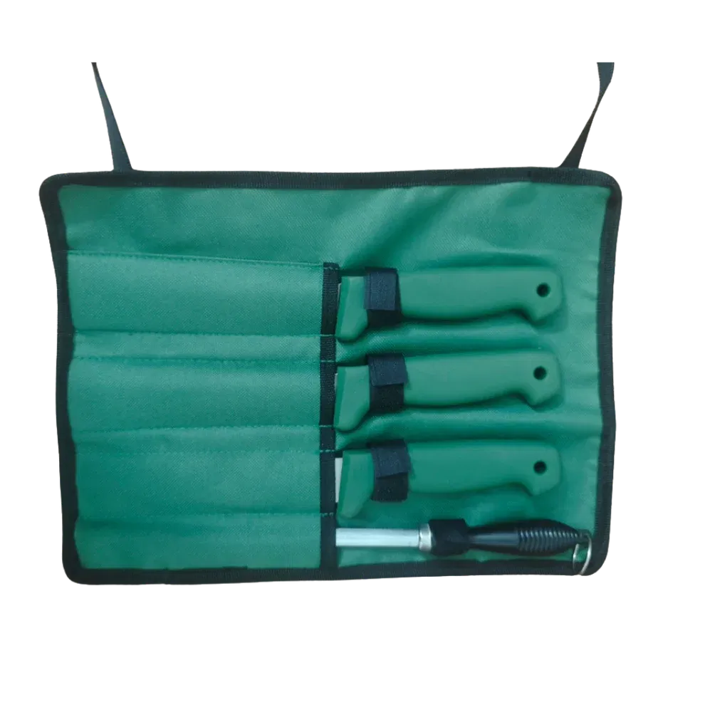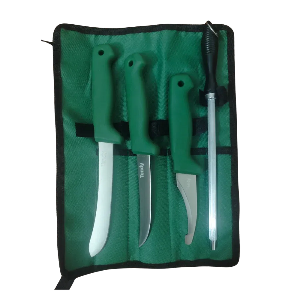 Komplett slaktset med tre knivar och brynstål. Bladen är tillverkade i slitstarkt 5CR15MOV-stål med en tjocklek på 2,5–3 mm och ergonomiskt gummerat TPR-handtag som ger säkert grepp. Brynstål i kolstål ingår för enkel skärpning samt en slitstark nylonfodral för förvaring och transport. Knivarnas stål har en hårdhet på 56-58 HRC.